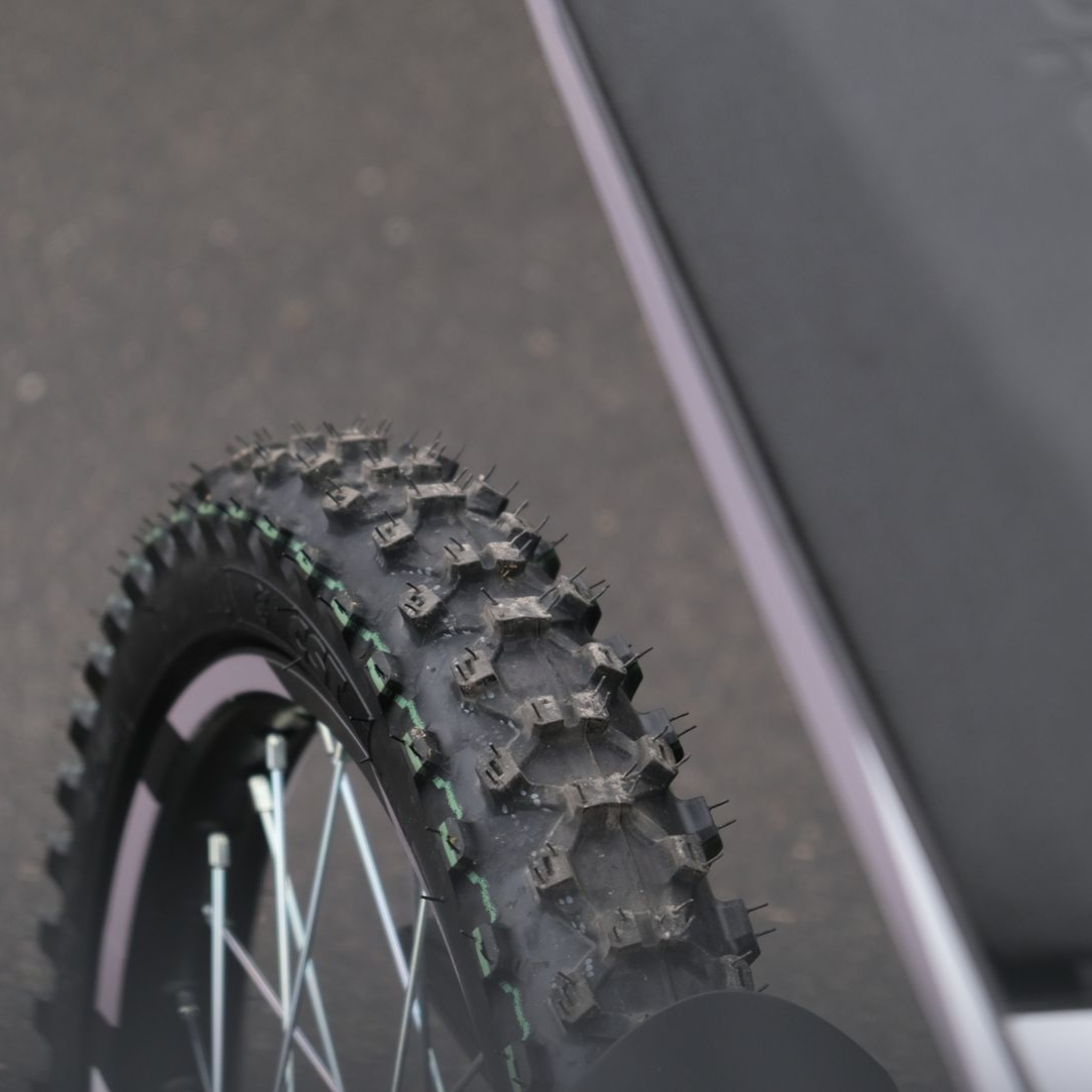 Die SWM BINSEN rollt auf CTS-Reifen der Größe 70/100-19", die speziell für den vielseitigen Einsatz auf und abseits befestigter Wege ausgelegt sind. Mit ihrem grobstolligen Profil bieten sie hervorragenden Grip auf losem Untergrund wie Schotter, Waldboden oder Gras – perfekt für Offroad-Fahrten oder ländliche Wege. Dabei zeigen die Reifen auch auf Asphalt eine gute Fahrstabilität und ausreichend Komfort, ohne übermäßig laut zu werden oder an Fahrpräzision einzubüßen.